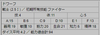 | キャラクター作成 | 5000 | 15 | 3000 | 器用×33 敏捷×8 筋力×20 生命×21 知力×6 精神×12 |